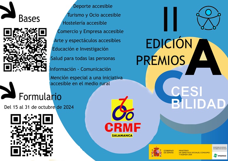 Los Premios Accesibilidad del Centro de Recuperación de personas con discapacidad física (CRMF) del Imserso en Salamanca, surgieron a partir de un trabajo compartido del centro con las entidades sociales que trabajan con personas con discapacidad en la ciudad. El año pasado, su primera edición, resultó un éxito y este año los volvemos a convocar con más ilusión.
